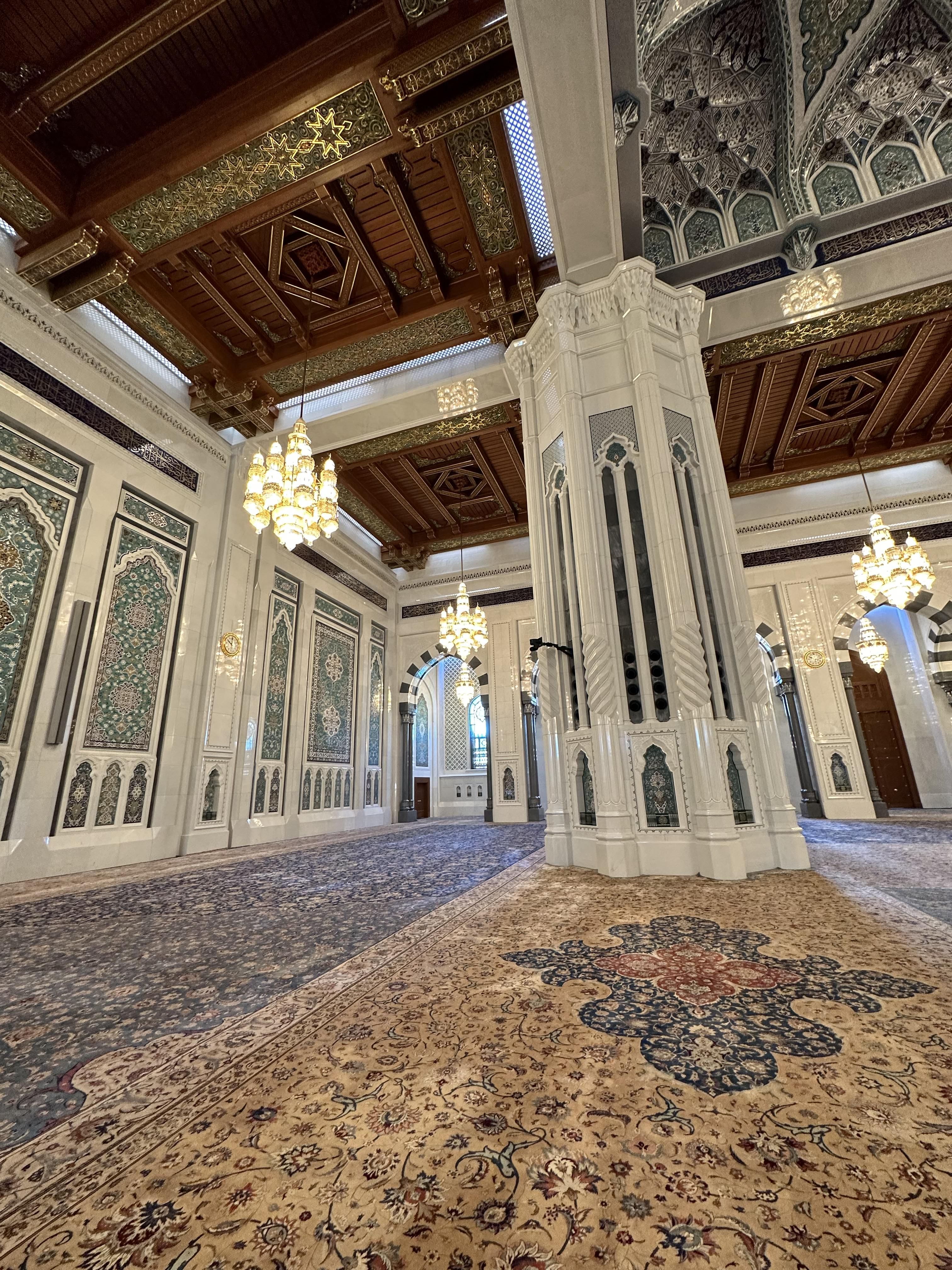 d. Sultan Qaboos Grand Mosque boasts a main prayer hall featuring a chandelier that weighs approximately 8.5 tons and is adorned with over 600,000 Swarovski crystals. The handwoven carpet in the prayer hall covers an impressive area of 4,343 square meters, making it one of the largest carpets in the world. The mosque has a worshippers' capacity of 20,000, and its construction took six years.