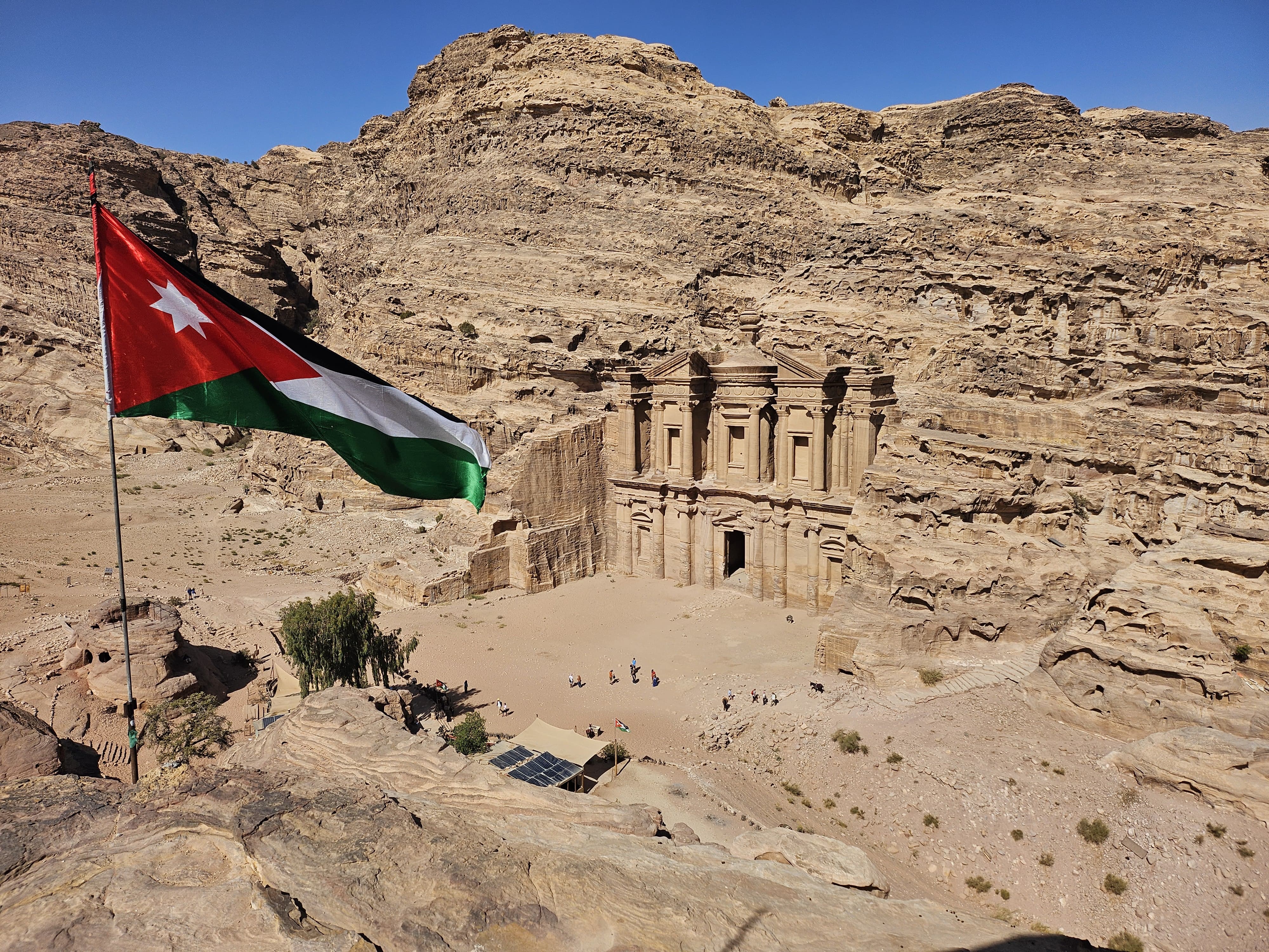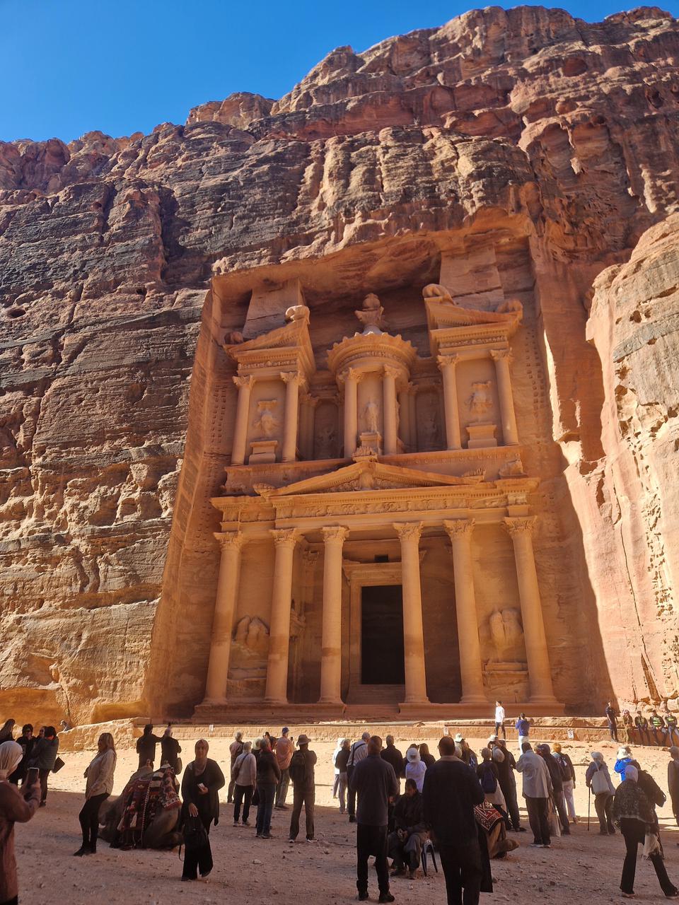 After breakfast, we will journey to the captivating red rose city of Petra, Jordan's most renowned attraction. Petra's origins date back to around the 6th century B.C., when it was established by the Nabataean Arabs, a nomadic tribe that settled in the region and established a thriving commercial empire that stretched into Syria. Accompanied by our adventure leader, we will traverse the canyon known as the Siq, leading to Petra's most iconic structure: the Treasury. Continuing along the Street of Facades, we'll explore the Royal Tombs and Pharaoh's Castle. You'll also have some free time to explore Petra at your leisure, perhaps even climbing the 800 stairs to reach the Monastery El Deir.