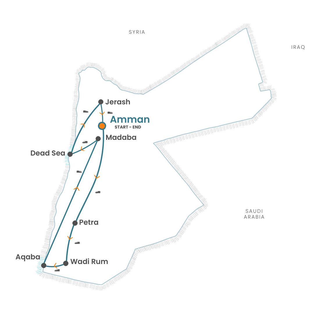 A captivating 7-day journey through Jordan’s ancient wonders, desert landscapes, and coastal retreats, from Petra and Wadi Rum to the Dead Sea and the Red Sea.
