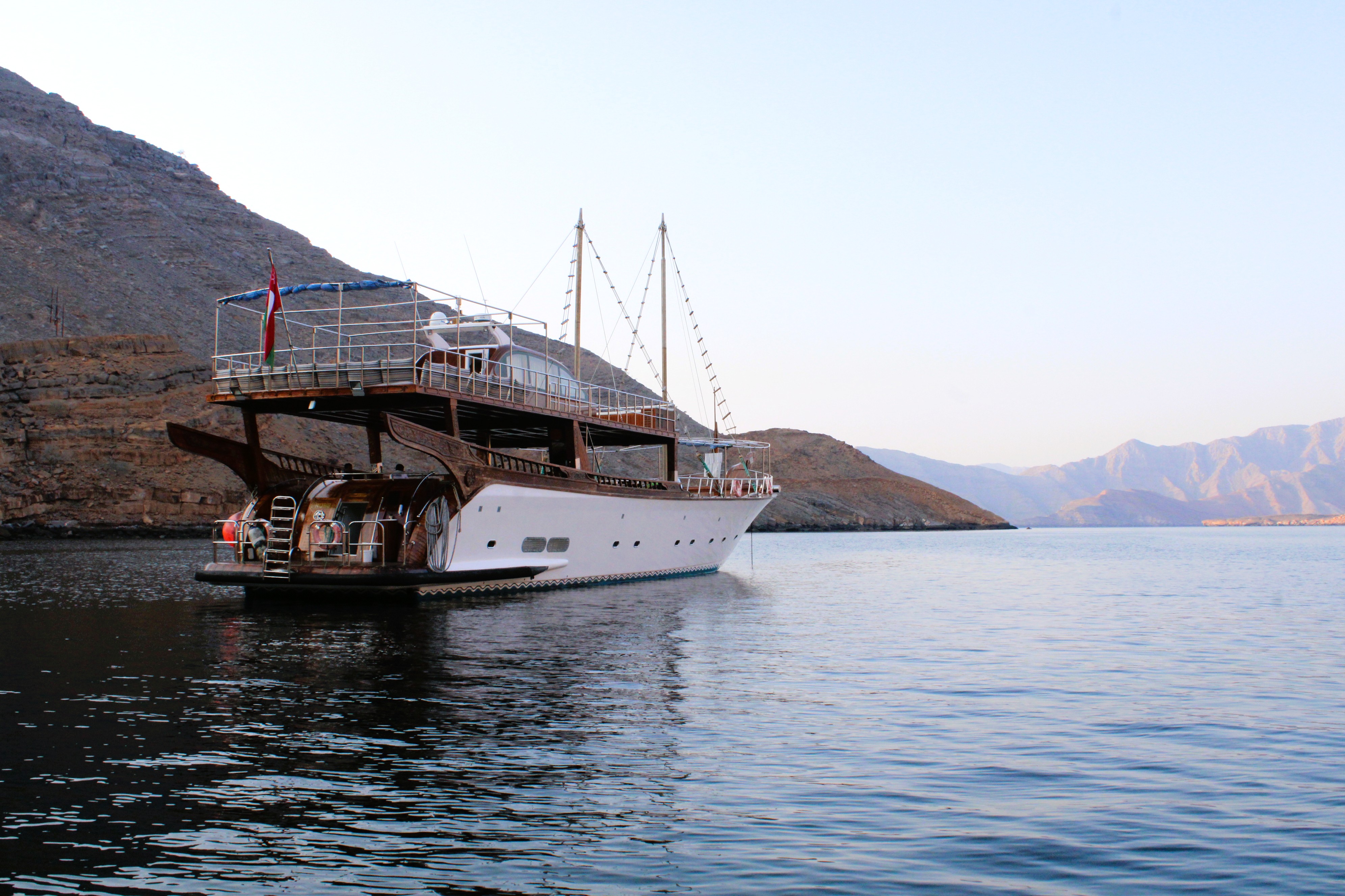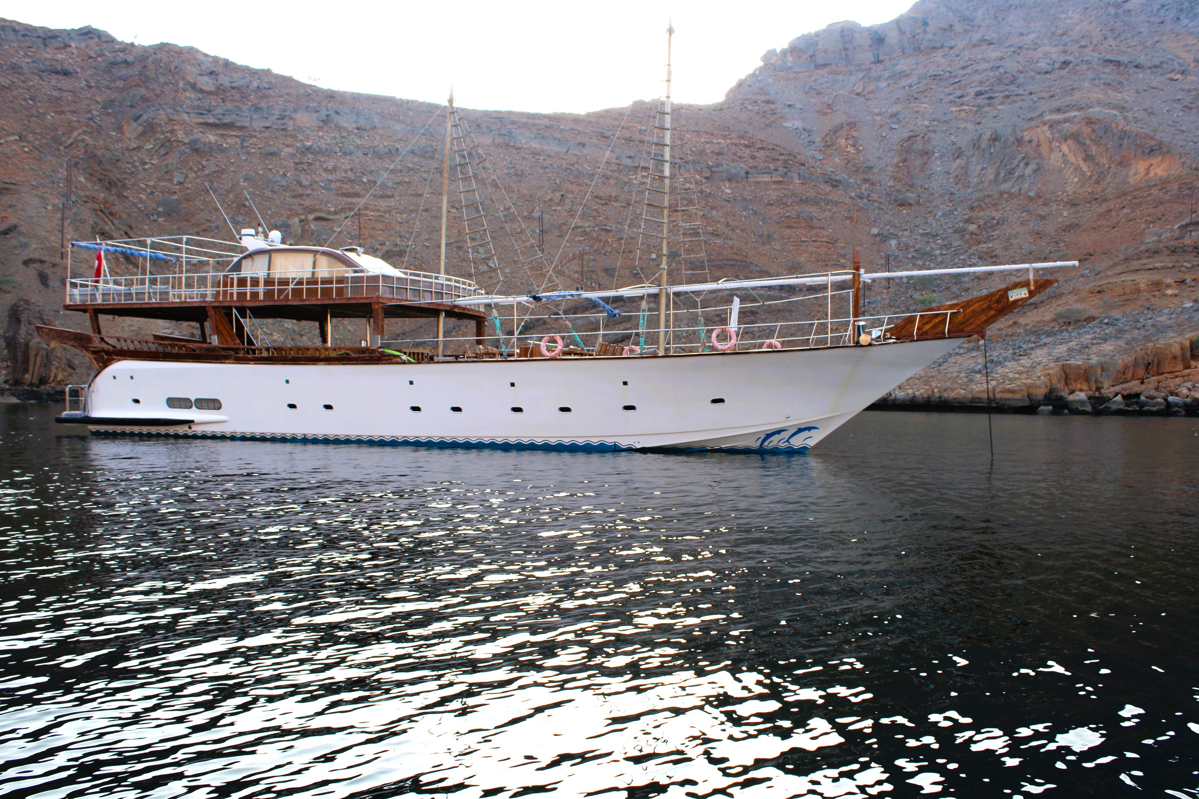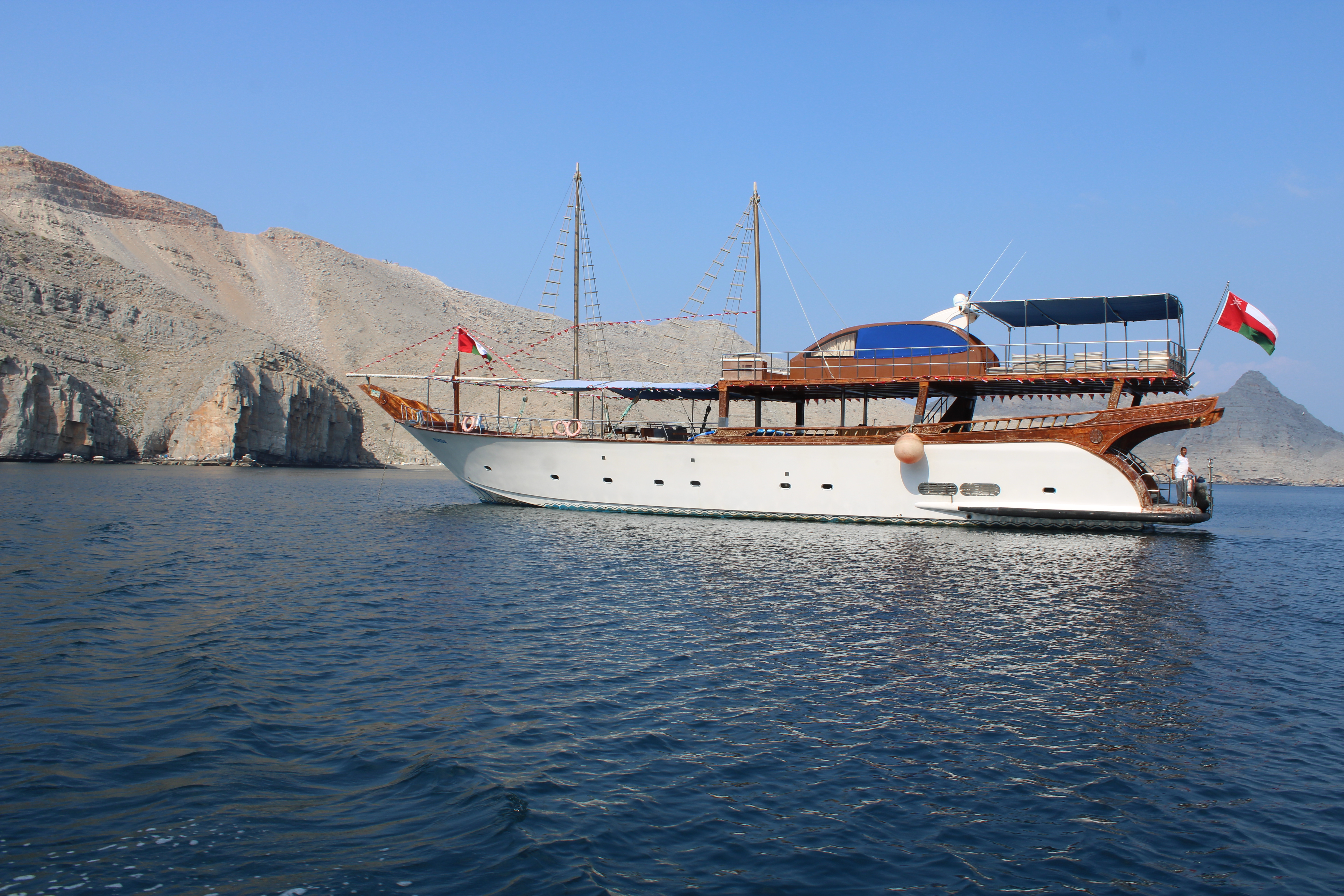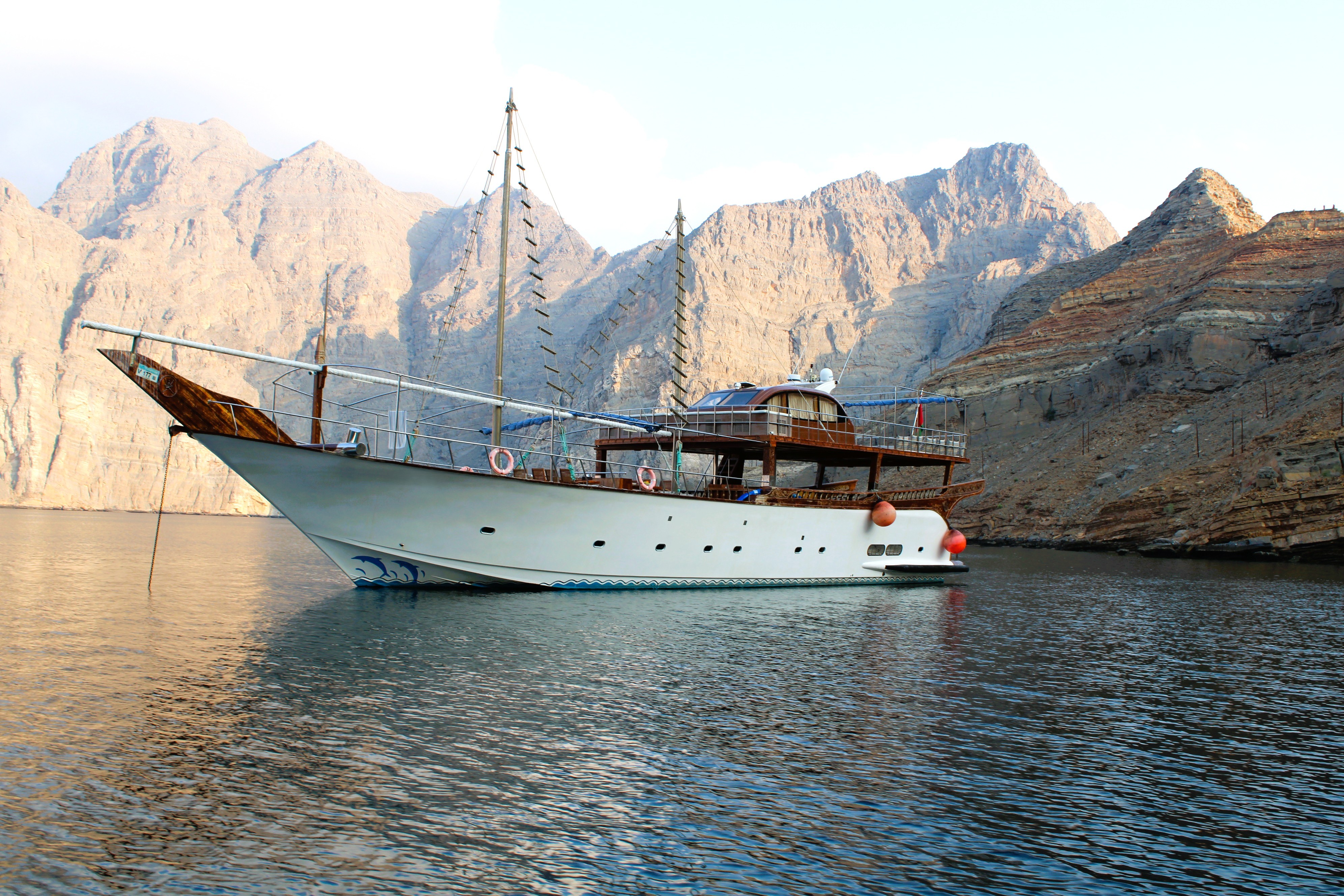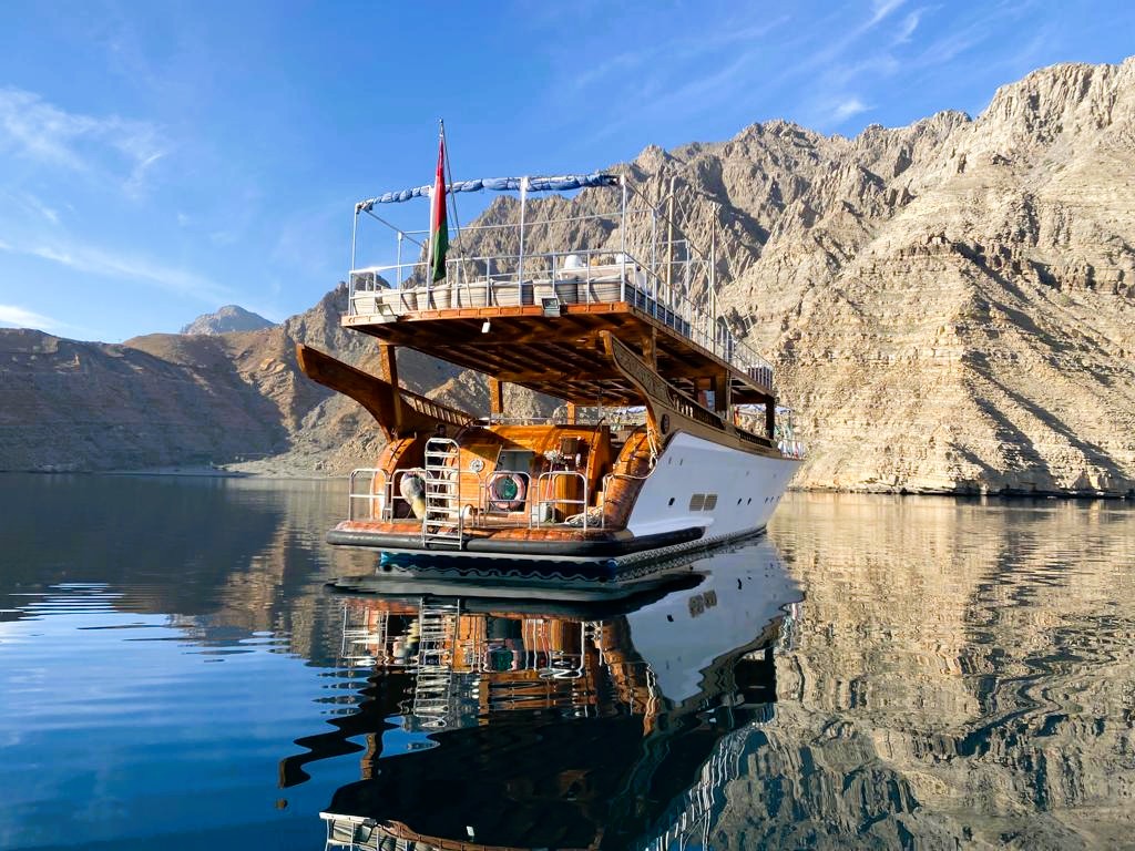 24 hour private luxury dhow cruise in Khasab exploring Khor Sham fjords with dolphin sightings, snorkeling, kayaking, onboard meals and overnight stay.