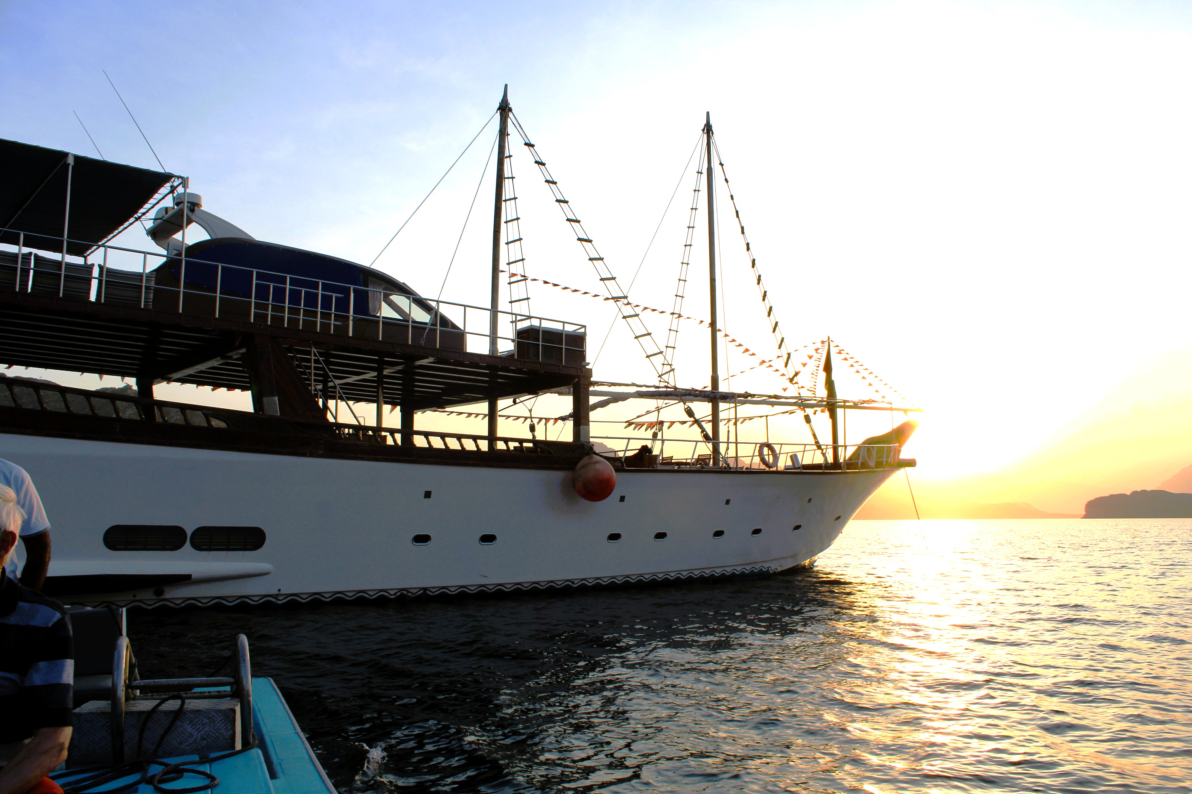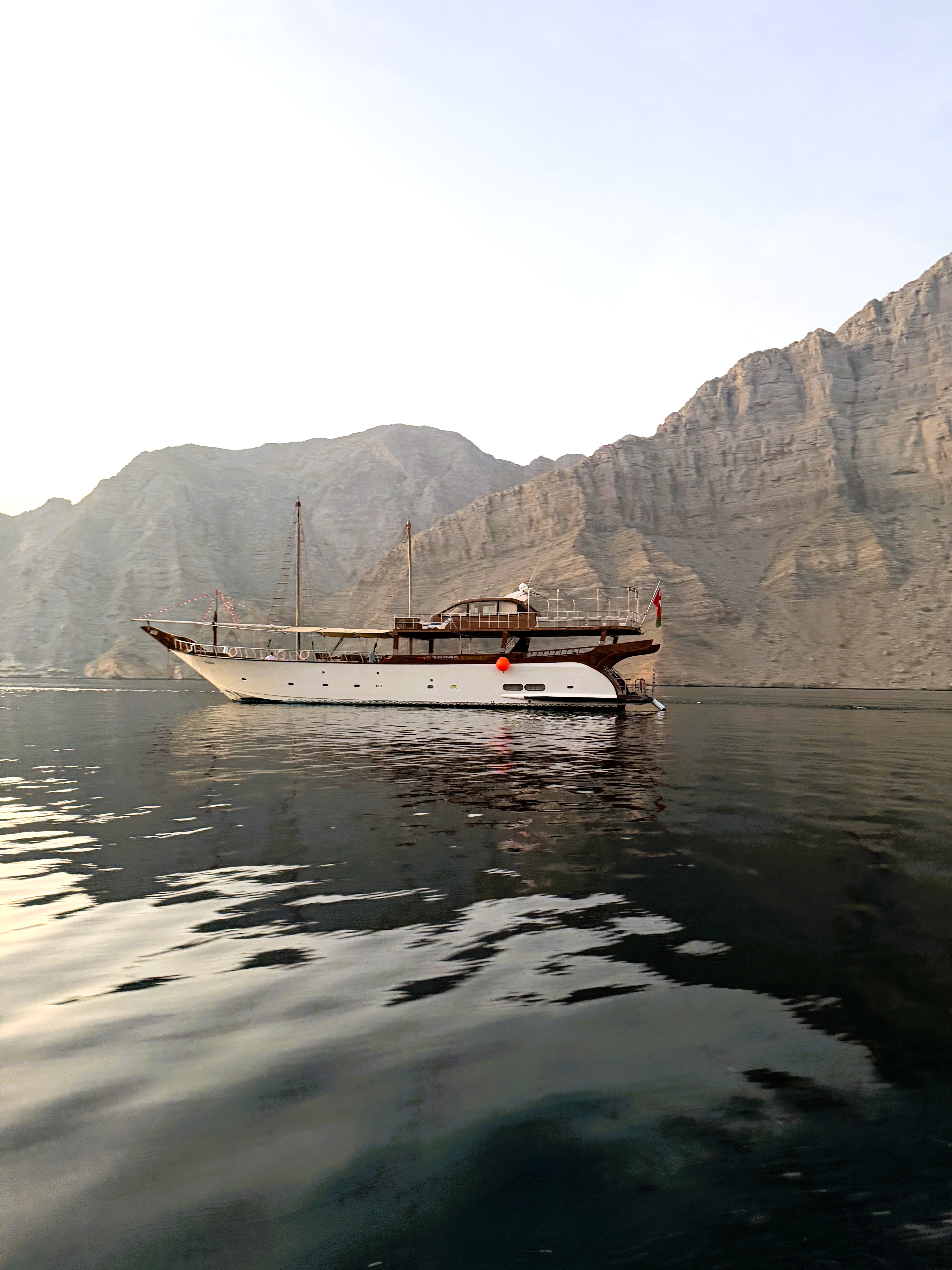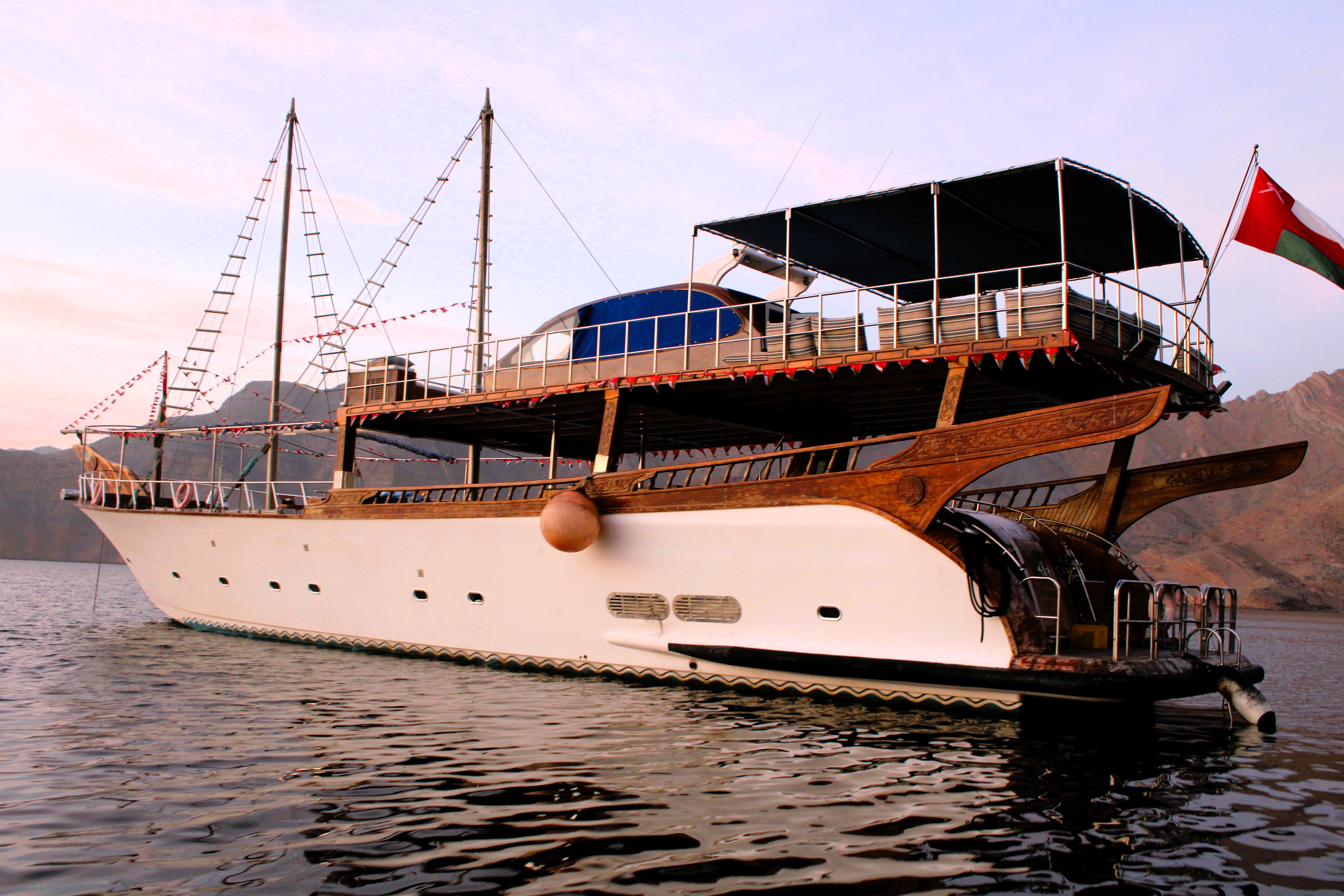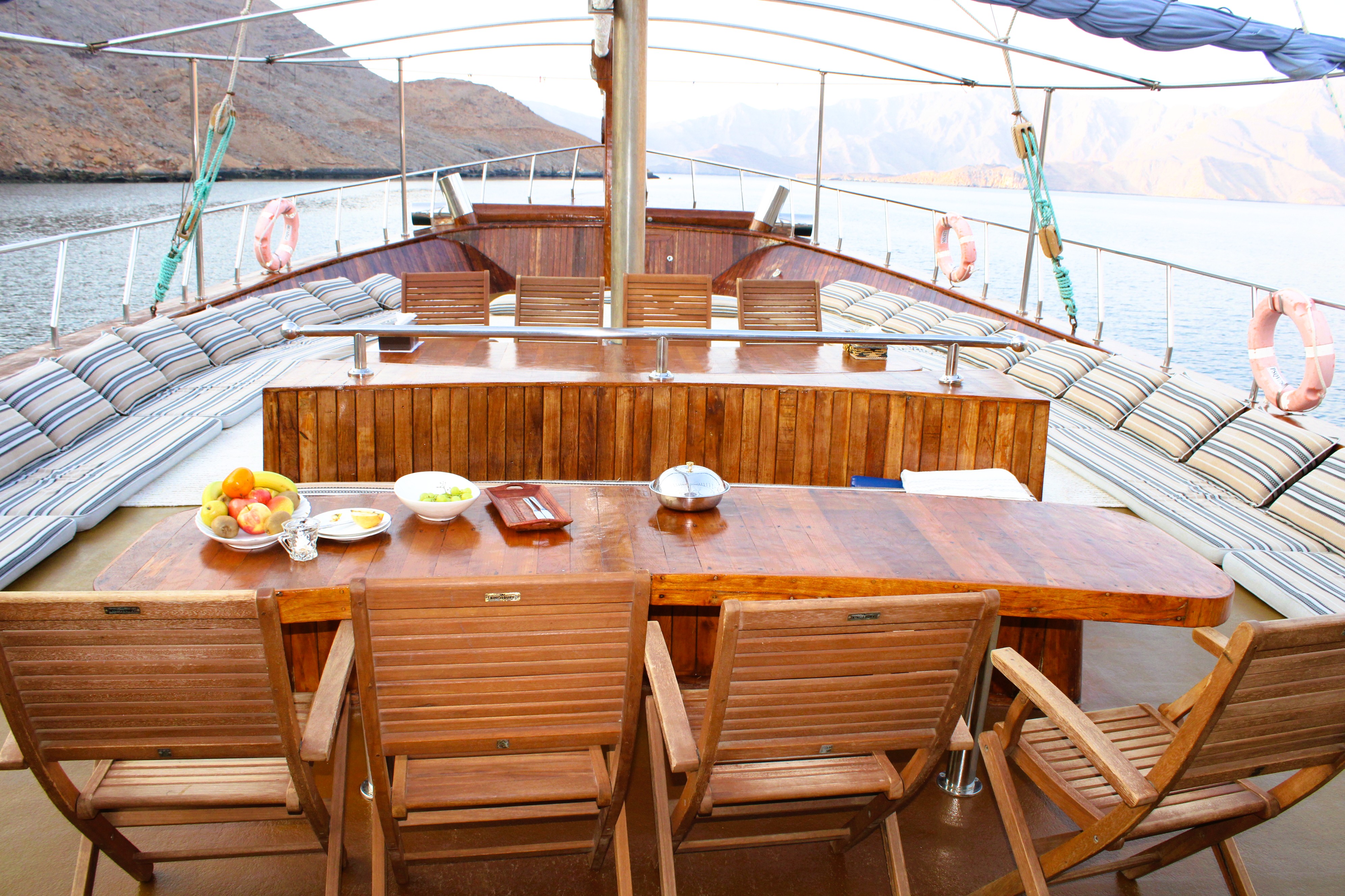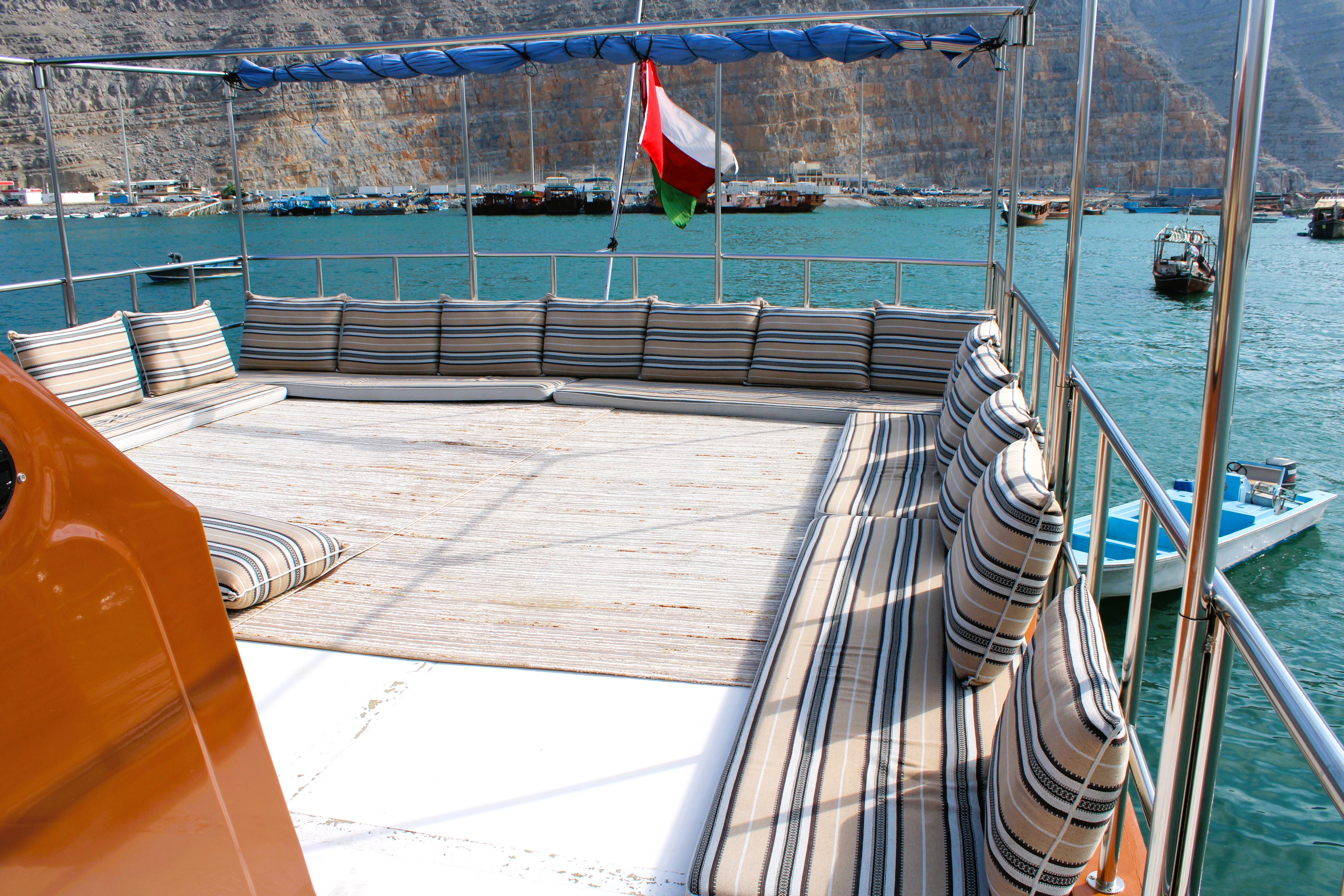 24 hour private luxury dhow cruise in Khasab exploring Khor Sham fjords with dolphin sightings, snorkeling, kayaking, onboard meals and overnight stay.