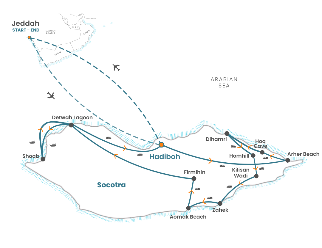 Your flight departs from Jeddah at 11:00am and arrives in Socotra at 2:30pm.